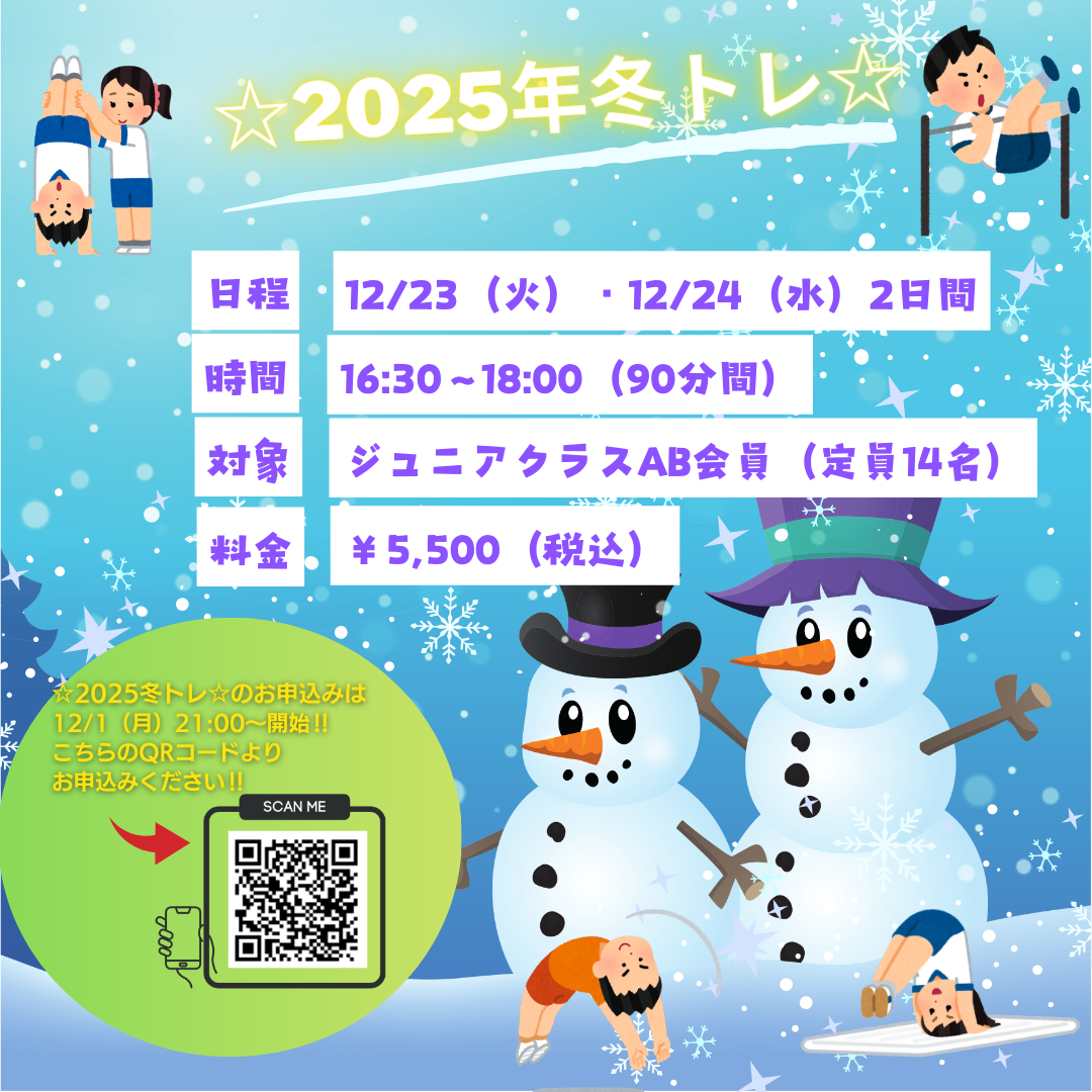 12月23(火)・24(水)の2日間で「2025冬トレ(ジュニアクラス向け)」を開催予定です。詳細は12月初旬にご連絡致します。