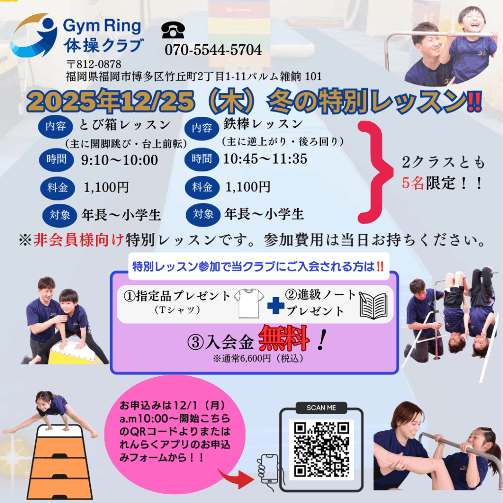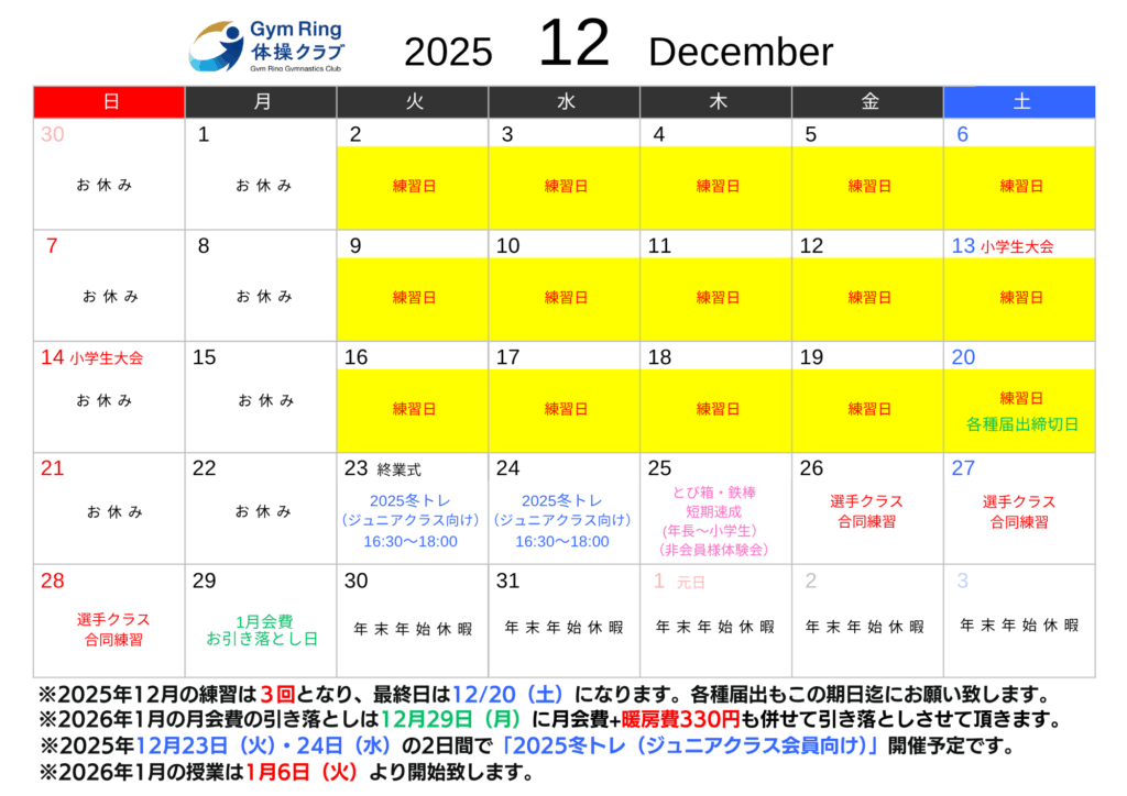 2025年12月のGymRing体操クラブのスケジュールになります。